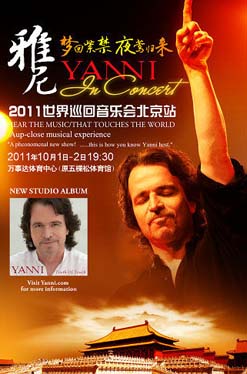 2011年10月1日、2日,当代最著名音乐家之一、新世纪音乐鼻祖、曾在北京紫禁城创下了万人空巷奇迹的“希腊钢琴王子”——雅尼将在北京万事达中心开启时隔15年之后的中国首场音乐会,用音乐与大家重述15年的想念之情。